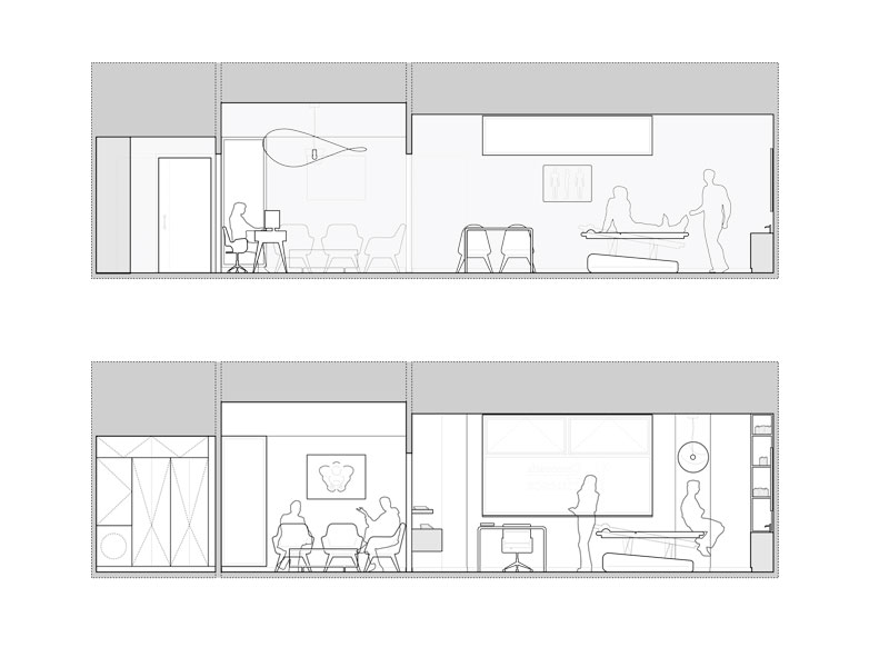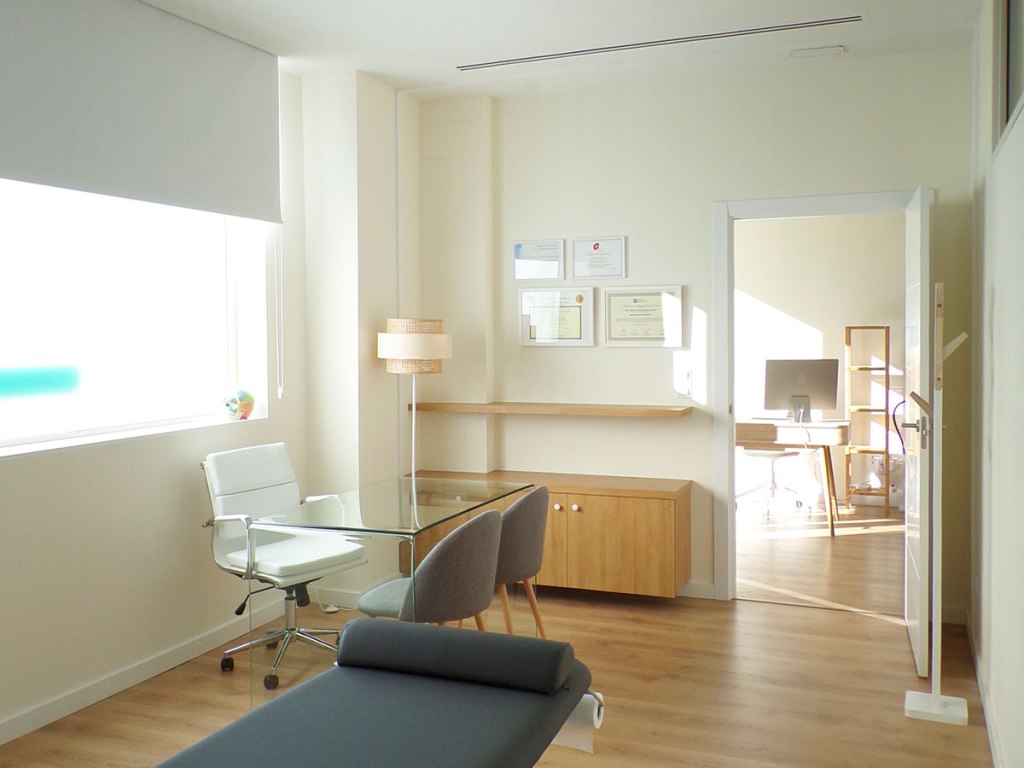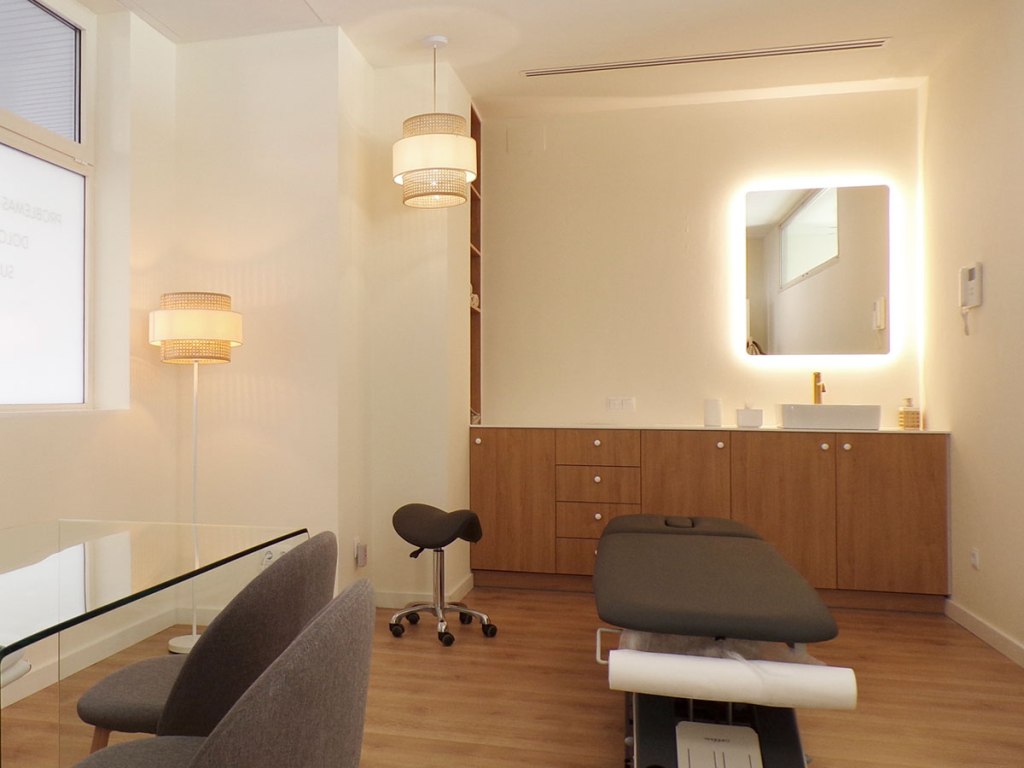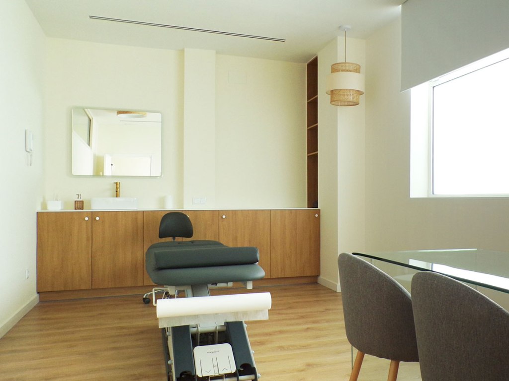El deseo de los clientes de compaginar la práctica profesional con la docencia de fisioterapia y osteopatía es lo que guía esta propuesta. La distribución de la planta permite, cumpliendo estrictamente las normativas de accesibilidad y salubridad, alternar los usos de centro sanitario y aula de formaciones para hasta 8 alumnos.