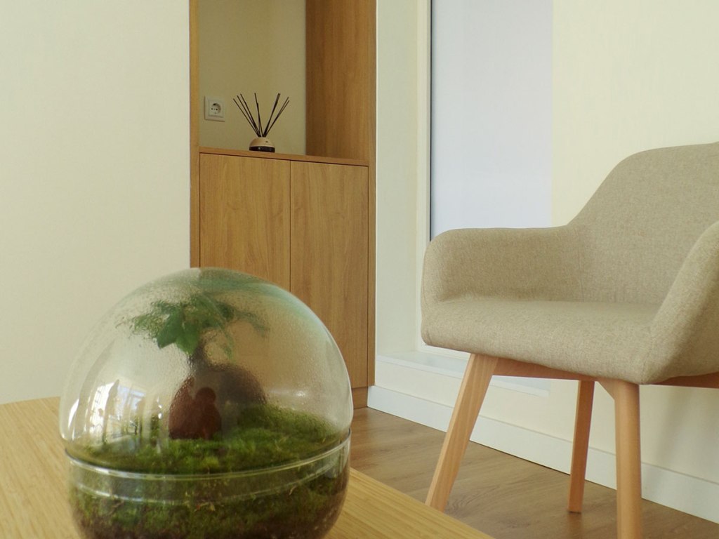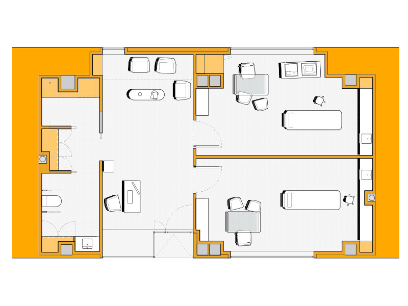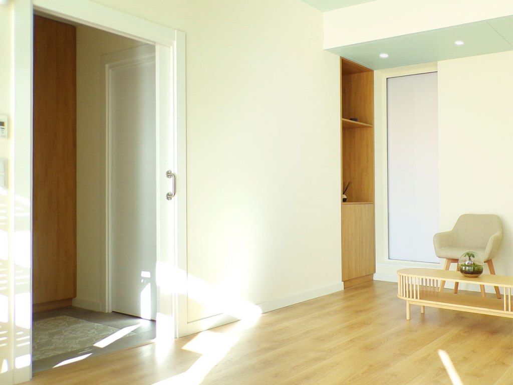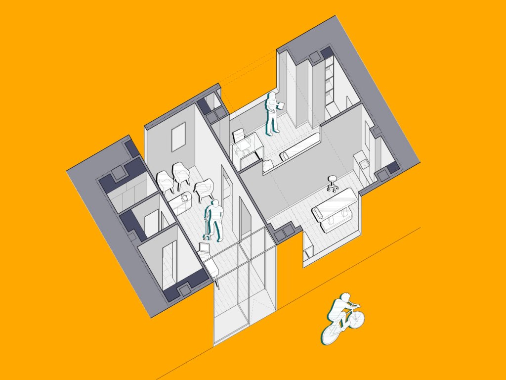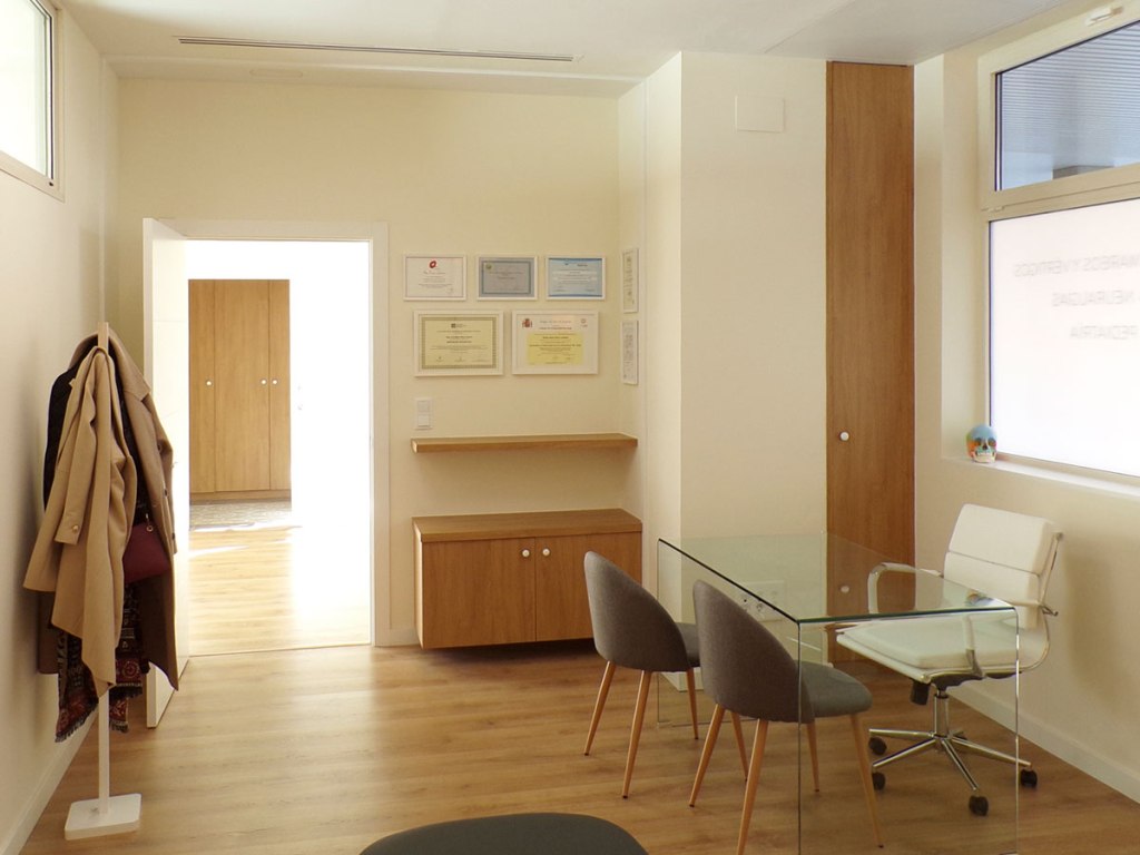 El deseo de los clientes de compaginar la práctica profesional con la docencia de fisioterapia y osteopatía es lo que guía esta propuesta. La distribución de la planta permite, cumpliendo estrictamente las normativas de accesibilidad y salubridad, alternar los usos de centro sanitario y aula de formaciones para hasta 8 alumnos.