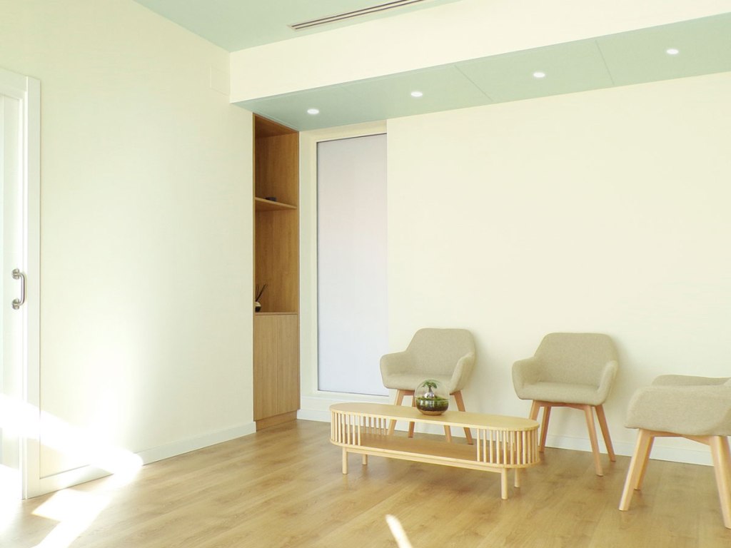 En horario de consultas, un amplio espacio de bienvenida recibe al paciente para que su experiencia comience de la mejor forma. Los tonos neutros y el lenguaje blando del mobiliario produce un tranquilo tránsito hacia la zona de atención de cada gabinete, donde se produce el diálogo con el profesional. La iluminación indirecta y el cuidado diseño de las rejillas y elementos facilita, por último, un agradable tratamiento en la camilla.